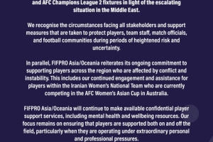与此同时,国际职业足球运动员协会亚洲/大洋洲分会重申将持续支持受冲突和动荡影响的区域球员。包括继续为正在澳大利亚参加女足亚洲杯的伊朗女足国家队球员提供支持与援助。