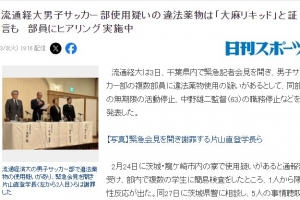 据悉,2月24日该部部分球员在宿舍接受违禁药物简易药检,其中一名球员检测结果为阳性,当月27日5名球员接受了茨城县警方的问询和听证,28日警方则是对涉案宿舍进行搜查,同日该校校长片山直登出席紧急新闻发布会并正式致歉。据悉,违禁药物为液态大麻物质。发布会上在被问及足球部是否会因此事废部时,片山直登表示目前并没有考虑。