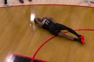 埃奇库姆投篮时被卡布撞到失衡摔倒背部着地 本场比赛不会回归
