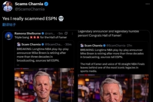 戏仿Shams账号Scams称名人堂解说员布林退休 骗到两位名记转发