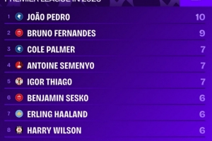 2026年英超参与进球榜:若昂·佩德罗10球居首,B费9球次席