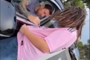 视频中,这位球迷在路边等待梅西,而梅西看到球迷后也停下车,摇下车窗为球迷的迈阿密国际球衣签名。