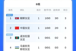 体育资讯3月5日讯 女足亚洲杯小组赛首轮全部比赛已全部结束,本轮中国女足2-0击败孟加拉国女足,收获开门红,但因净胜球劣势暂居B组第二,朝鲜女足则是3-0轻取乌兹别克斯坦女足,排在B组头名。