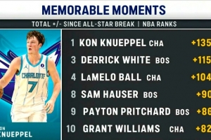 全明星后至今总正负值:克尼佩尔+135领跑 怀特&三球分列第3&第4