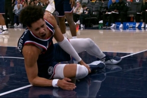 不要啊!尼德豪泽盖帽落地时崴脚受伤 十分痛苦&被搀扶离场