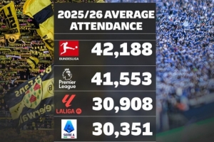 欧洲联赛场均上座人数榜:德甲居首,英超、西甲、意甲、德乙前五