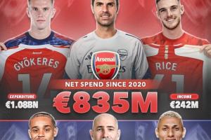 据Score90统计,自2020年以来,阿森纳在转会市场引援共花费10.8亿欧元,收入2.42亿欧元,净支出8.35亿欧元;而热刺共花费11.1亿欧元,收入3.46亿欧元,净支出7.63亿欧元。