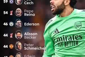 门将前百场英超零封榜:切赫59场居首,拉亚、范德萨43场并列第6
