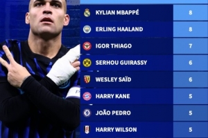 本赛季5大联赛制胜球排行:劳塔罗9球居首,姆巴佩、哈兰德8球