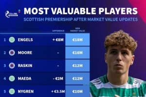 体育资讯3月6日讯 德国转会市场更新苏格兰超级联赛球员身价,并列出最高身价榜单,恩格斯1800万欧元居首。