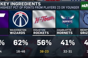 23岁及以下球员得分占比前五球队:火箭第三 战绩38-22不“合群”