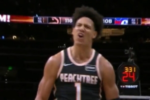 霸气侧漏!杰伦·约翰逊强突乌布雷 顶着两人双手滑翔暴扣!
