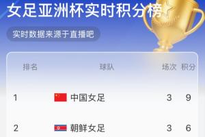 半场实时积分榜:中国女足反超朝鲜女足,9分跃升至小组第一!
