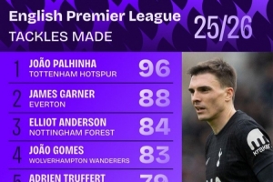 本赛季英超抢断次数榜:帕利尼亚96次居首,加纳88次第二