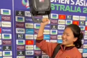 嗨起来!中国女足姑娘路过混采区时尽情庆祝