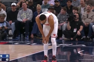 希望无大碍!唐斯强突大洛左手上篮不中 随后捂着膝盖不舒服