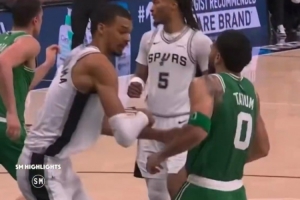没盖到!文班亚马追防塔图姆上篮 落地后推了一把后者飞出边线