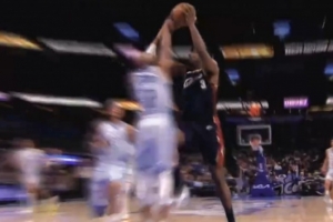 杰伦·布朗投篮下落时肘到巴洛面部 裁判回看后没有判罚