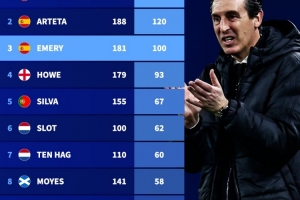 以下为埃梅里执教维拉首秀以来,英超主教练各项赛事赢球场次榜: