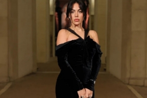 32岁的乔治娜身着引人注目的黑色天鹅绒连衣裙,摆拍照片。裙长及膝,肩带绕过肩膀。她搭配了黑色高跟鞋和黑色手包,完成了这身造型。