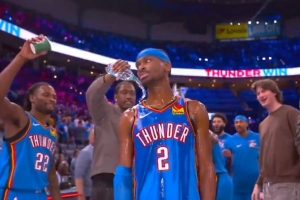 都给记小本本上!雷霆众将赛后给亚历山大泼水 后者一脸生无可恋