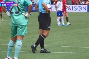 体育资讯03月14日讯 女足亚洲杯1/4决赛,中国女足vs中国台北女足。第63分钟,陈巧珠与裁判撞在一起。