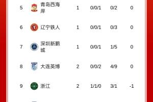 积分榜:泰山积分归零升第四,浙江负1分第九,申花负6分第14