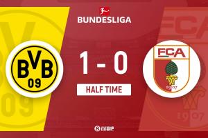 半场-多特1-0奥格斯堡 阿德耶米抢点破门里贝罗失单刀拜尔中柱