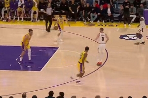 兄弟,你搞偷袭?东契奇和八村塁保护篮板 被后者不慎击中要害