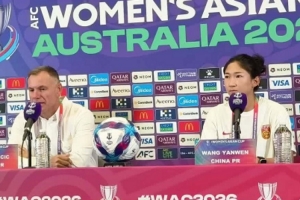 中国女足主教练米利西奇携王妍雯出席亚洲杯半决赛对阵澳大利亚女足赛前发布会。