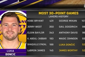 东契奇在湖人52场单场30+追平沃西居队史第11位 科比431次最多
