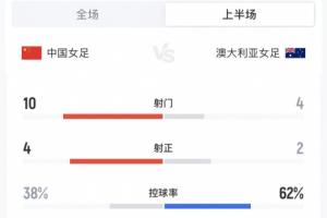 中国女足vs澳大利亚半场数据:射门10-4,射正4-2,控球率38%