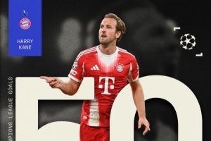 凯恩是欧冠历史第11位达成50球的球员,英格兰球员首人