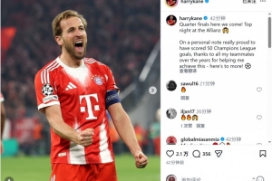 凯恩社媒:1/4决赛我们来了,感谢帮助我达成欧冠50球的队友