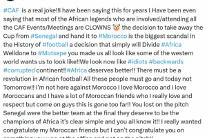“将奖杯从塞内加尔手中夺走并转交给摩洛哥的决定,是足球历史上最大的丑闻!这一决定只会分裂非洲。干得好啊,莫特塞佩(非足联主席),你让我们所有人看起来就像西方世界想让我们呈现的那副模样!我们现在看起来就像一群傻瓜,一个落后、腐败的大陆!非洲值得更好的对待!非洲足球必须来一场革命,所有这些人必须下台,而且就是现在,不是未来!”