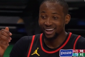 自己都不敢相信!库明加后场罚球线 单臂扔三分直接扔进篮筐!