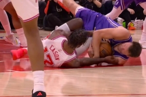 拼抢激烈!东契奇与伊森倒地争球都不肯撒手 一片混战