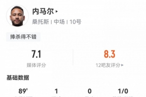 内马尔数据:2射1正1进球2关键传球,传球成功率91.1%,评分7.1