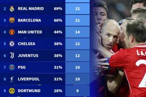 皇萨仁断层领先!欧冠1/4决赛参赛次数:拜仁24次居首,曼联第四