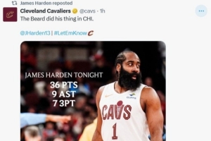哈登本人转发!骑士官推晒哈登数据海报:大胡子在芝加哥大显身手
