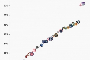 【一图流】本赛季中投占比:国王火箭独一档&湖凯也挺高 公牛仅6%
