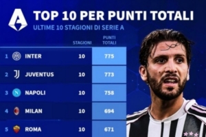 过去10个赛季意甲积分榜:国米775分居首,尤文773分次席