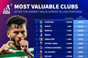 体育资讯3月22日讯 德国转会市场列出了葡超俱乐部身价排名,葡萄牙体育、波尔图、本菲卡前三。