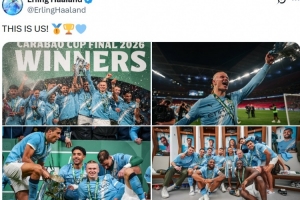 哈兰德社媒晒与队友庆祝夺冠合照,配文:这就是我们