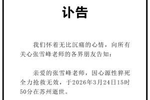 亲爱的张雪峰老师,因心源性猝死全力抢救无效,于2026年3月24日15时50分在苏州逝世。