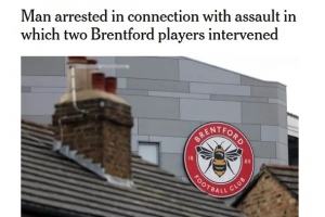 TA:一名男子涉嫌袭击他人,两名布伦特福德球员曾试图介入制止