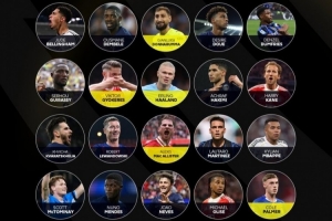 登贝莱(巴黎)、哈兰德(曼城)、若奥-内维斯(巴黎)、贝林厄姆(皇马)、莱万(巴萨)