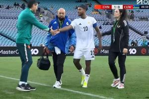 巴库纳接受队医治疗后到场边,邵佳一上前与其握手致意,随后拍了拍巴库纳的头。