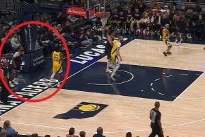 太危险了!加兰突破落地踩到场边摄影师有点崴脚 返回更衣室
