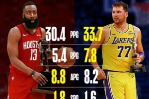 东契奇本季场均33.7分7.8板8.2助 MVP赛季哈登30.4分5.4板8.8助